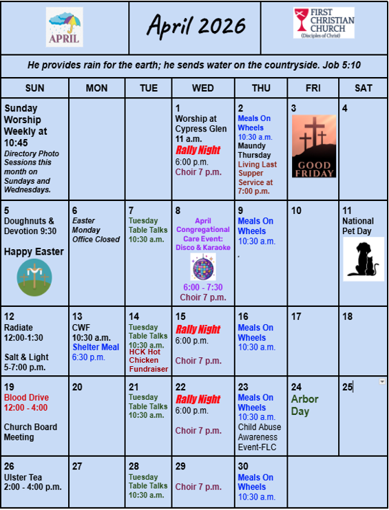 Sunday Worship will be conducted via Facebook Live at 10:45am each week. Click here to go directly to our Facebook videos